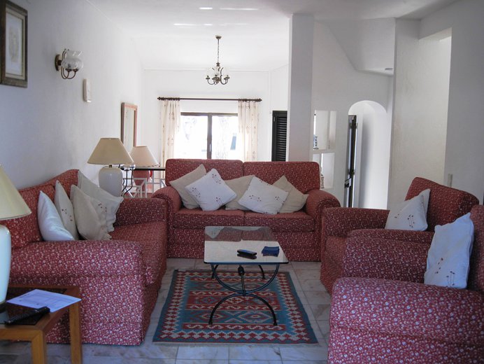 Lounge with marble floors and patio door to rear terrace. Lower dining area. Air conditioning. Cable TV and video. Front door leads out to terrace with seating, overlooking pleasant garden area.
