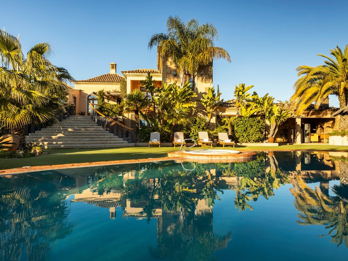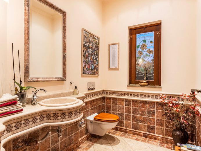 Arrive at the double security entrance gates and press your fob to open the way to your holiday. Drive along the curved driveway up to the front courtyard giving access to the main house and also the guest lodge. The entrance door of Cazan brings you into a Moorish hallway with a domed brick ceiling. This is the hub of the house and has a very pretty guests cloakroom.
