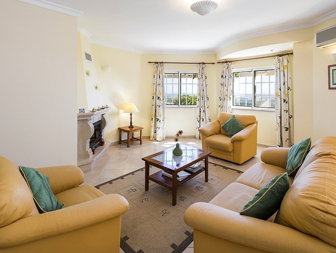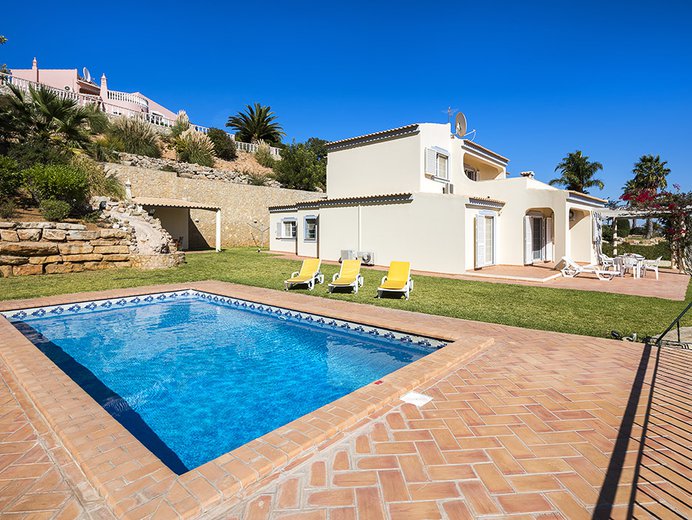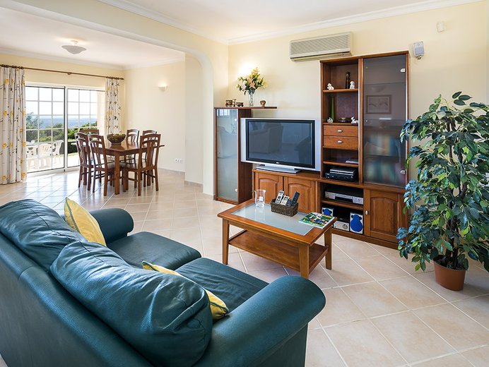 This countryside villa takes advantage of the delightful hillside location overlooking the coastline from Olhao to Vilamoura. Set on two levels; on the ground floor there is a hallway, with a guest cloakroom, and a lounge area with Sat TV and the dining area, with patio doors opening onto the lower terrace which has a covered area and barbecue for “al fresco” meals. The kitchen is fully fitted and equipped, including microwave, dishwasher, washing machine, kettle and toaster. The villa has 3 bedrooms, a master double bedroom with en suite bathroom and two twins with shower en suite. The furnishings are bright and airy and there is plenty of wardrobe space and storage. Outside, garden with lawn, flowers, shrubs and a rectangular swimming pool of 10 x 4 mts. The house is equipped with air conditioning units in all bedrooms and lounge. There is daily cleaning service from Monday to Friday, except on bank holidays. Other features: Hairdryer Safe Pool towels