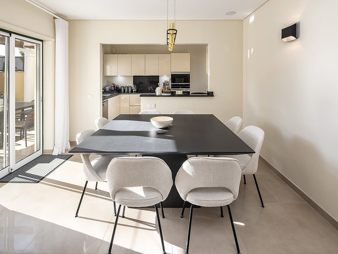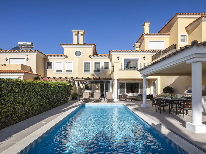 Charming 3 bedroom linked villa, located in the prestigious private condominium of Fazenda Santiago, only a short driving distance from the well know luxurious resort of Vale do Lobo and its bars, restaurants, beaches, golf courses and supermarket. The villa has been totally refurbished in 2019 and has a modern and welcoming interior design. Set on three floors; on the ground floor you can find the lounge, dining area, kitchen, a cloakroom and a bedroom. On the basement level there is a convenient bathroom (with shower), a TV room with large flat screen TV and a full range of Sky channels, and a small laundry area. On the first floor of the property you will find two more bedrooms with south facing views over the surrounding countryside. With an open plan to the dining area and lounge is the fully fitted kitchen with fridge, oven, microwave, hob, coffee maker and dishwasher. This whole living area and the outside area are equipped with bluetooth Hi-Fi music system to create a desirable ambiance. The accommodation comprises three comfortable en suite bedrooms, all of them equipped with fitted wardrobes. The ground floor bedroom and one of the upstairs bedrooms are twin/doubles and the first floor master bedroom is a double. The bathroom in the master bedroom has a double sink, a bath and a separate shower. The other two bedrooms are equipped with a shower room. The laundry is equipped with a washing machine and a tumble dryer. Through the French windows from the lounge / dining area, you will reach the pool terrace with a small lawned garden. Here you will find a seating space ideal to relax and enjoy an alfresco meals or cocktails and two different covered dining areas, one of which is below the covered gas BBQ terrace. The rectangular shape swimming pool measures approximately 7,8m x 3,5m and can be heated upon request at an extra charge. Here you can also find comfortable sun loungers and a parasol to make the most of your days in the sun. This villa is equipped with air conditioning units. This property has Wi-Fi access. There is daily cleaning service from Monday to Friday, except on bank holidays. Other features: Hairdryer Safe Pool towels Fazenda Santiago is a gated community with a fully equipped gym, his and hers saunas, all weather tennis courts and night time security patrols. Fazenda Santiago is just 3 kms from the beaches of Vale do Lobo and Loule velho and within a 5km radius are a vast array or restaurants, sports facilities and shopping options.